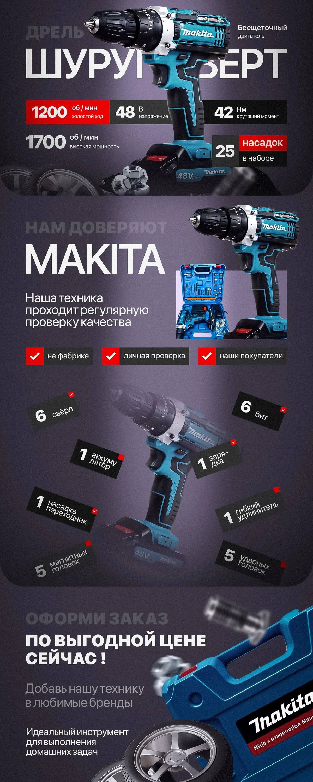 Дрель-шуруповерт Makita, 48V, 2 АКБ