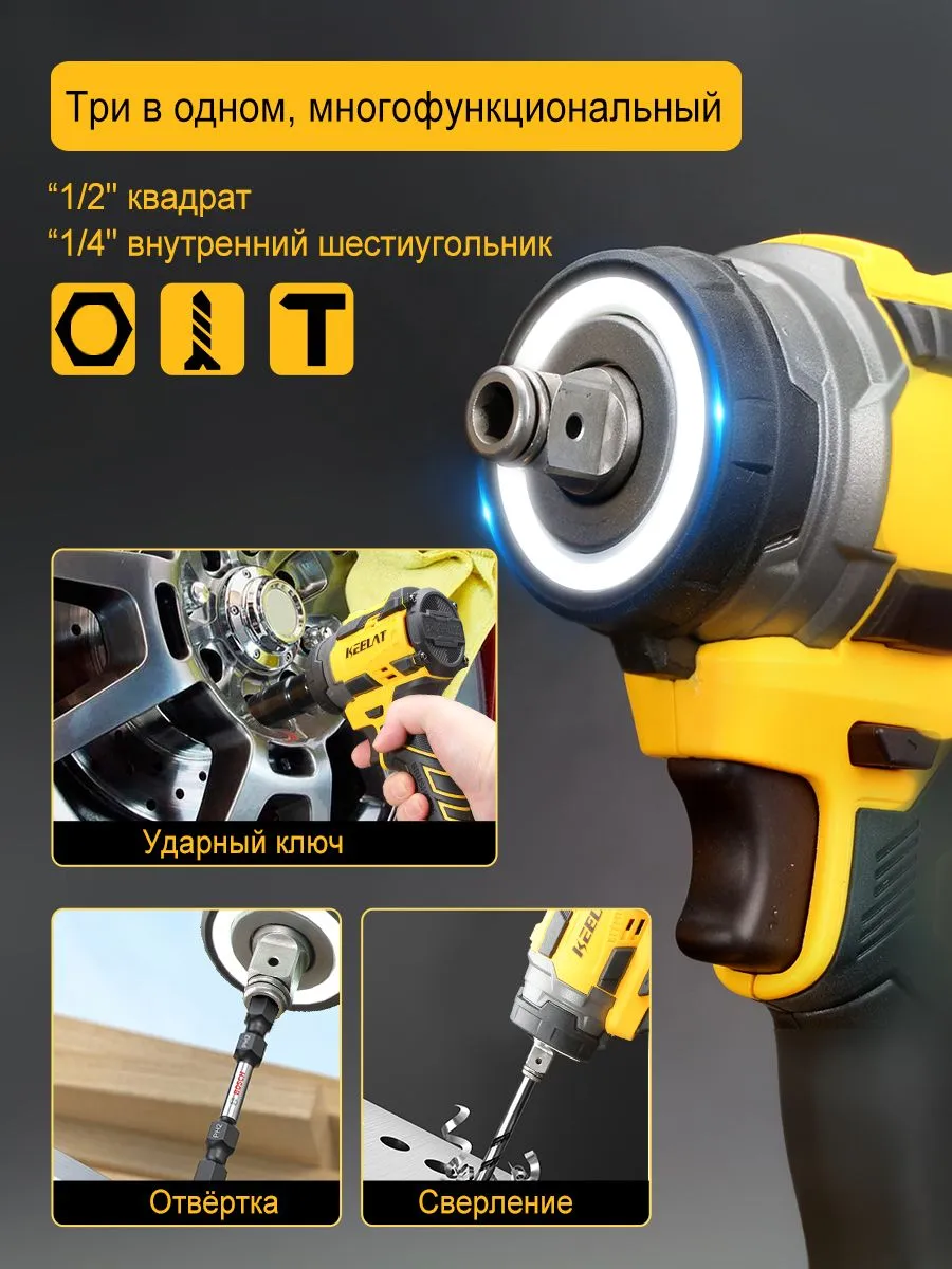 Комплект включает в себя: 1 x Инструментальный ящик 1 x Ударный ключ 1 x Руководство пользователя 1 x Зарядное 2 x Аккумулятор литий-ионный 3,0 Ач