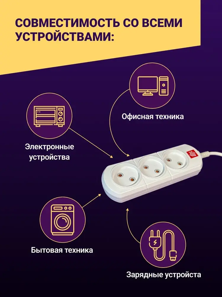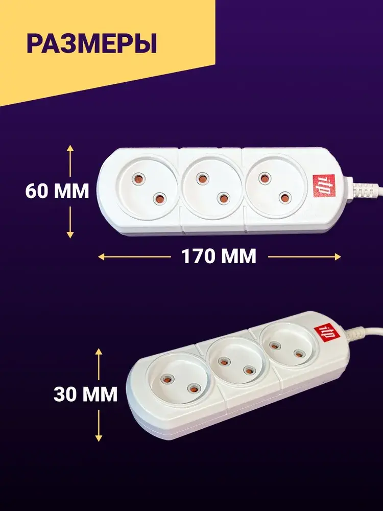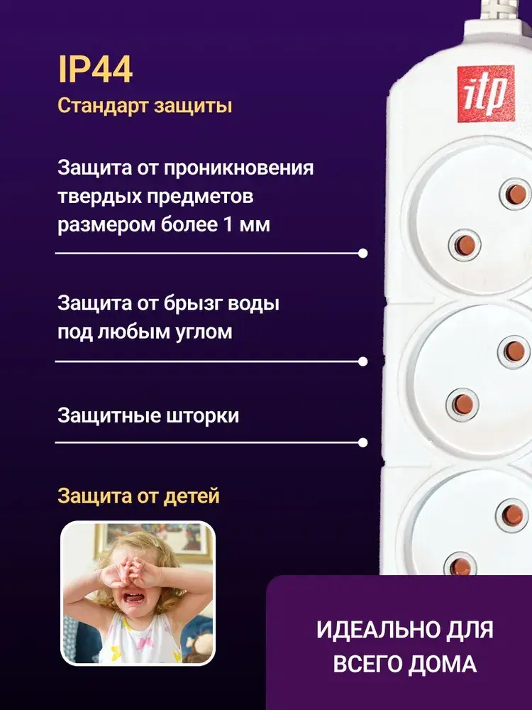 Удлинитель ITP U3 Надежный бытовой удлинитель на 3 розетки. Длина шнура 5 метров. Провод ПВС 2*1,5мм 16А. Подходит для дома, дачи и офиса. Выключатель со светодиодной индикацией. Корпус удлинителя изготовлен из ударопрочного самозатухающего ABS пластика. Мы думаем о безопасности Ваших детей, поэтому все наши изделия снабжены защитными шторками на розетках. Продукция имеет сертификаты соответствия EAC требованиям ТР ТС 004/2011 "О безопасности низковольтного оборудования", декларации соответствия EAC требованиям ТР ТС 020/2011 "Электромагнитная совместимость технических средств"и 037/2016 "Об ограничении применения опасных веществ в изделиях электротехники и радиоэлектроники". Модельный ряд включает удлинители 3, 4 и 5 розеток с сечением провода ПВС 0,75/1/1.5 током нагрузки на 10A и 16A, проводами 2/3/5/7 метров. Показать полностью -i/ww1200/6664750146.jpg