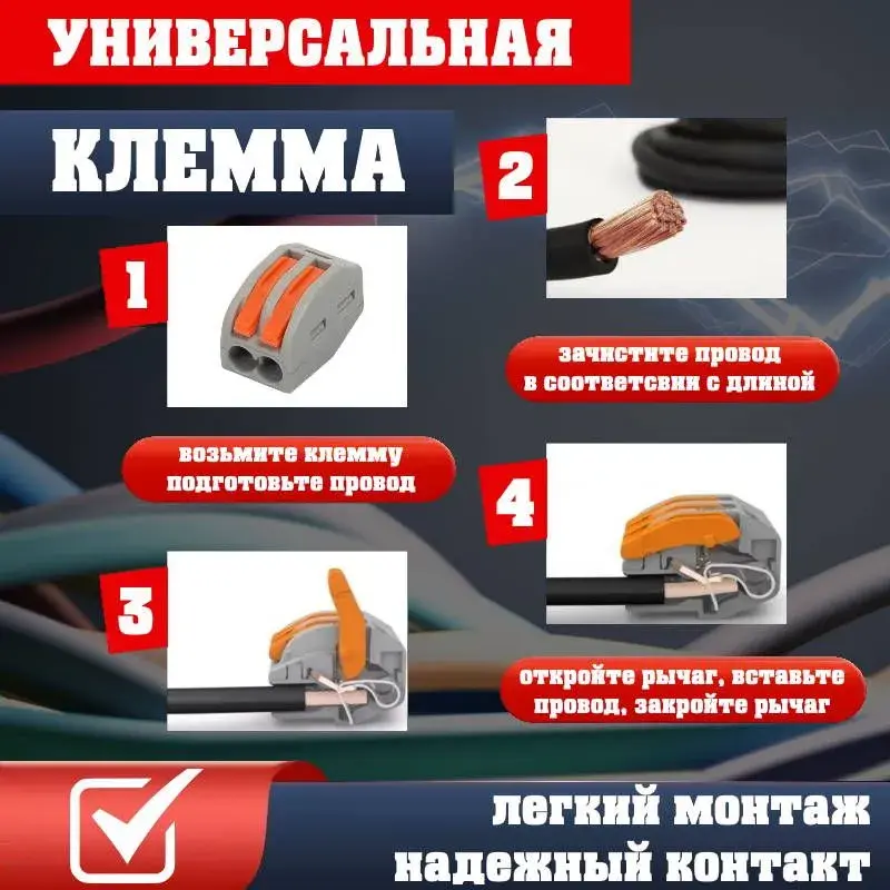 Универсальная соединительная клемма на 2 контакта Универсальная соединительная клемма 222-412 (аналог клеммы Wago) представляет собой блок с плоско-пружинным зажимом, предназначенный для подключения любых типов медных и алюминиевых проводов: моножильных и многожильных, тонкопроволочных. Легкий монтаж, надежный контакт Как для мастеров, так и для любителей, с помощью клеммы Ваго значительно упрощается электромонтаж и проводка. Зажим крокодил для проводов осуществляется при помощи оранжевых рычагов клемы. Наличие специального паза в корпусе клеммы для размещения рычага в закрытом положении надежно фиксирует контакты и предотвращает случайное отсоединение проводника. Подходит для использования с любым видом кабеля 2-проводная клемма рассчитана на подключение внутри помещений проводов диаметром от 0,2 мм до 4 мм. Для монтажа не требуется специального инструмента. Сечение подключаемых проводов: для одножильных сечение 0.2 - 4 мм., для многожильных 0.2 - 2.5 мм. Показать полностью -1-l/ww1200/7353247449.jpg -1-o/ww1200/7353247452.jpg -1-m/ww1200/7353247450.jpg