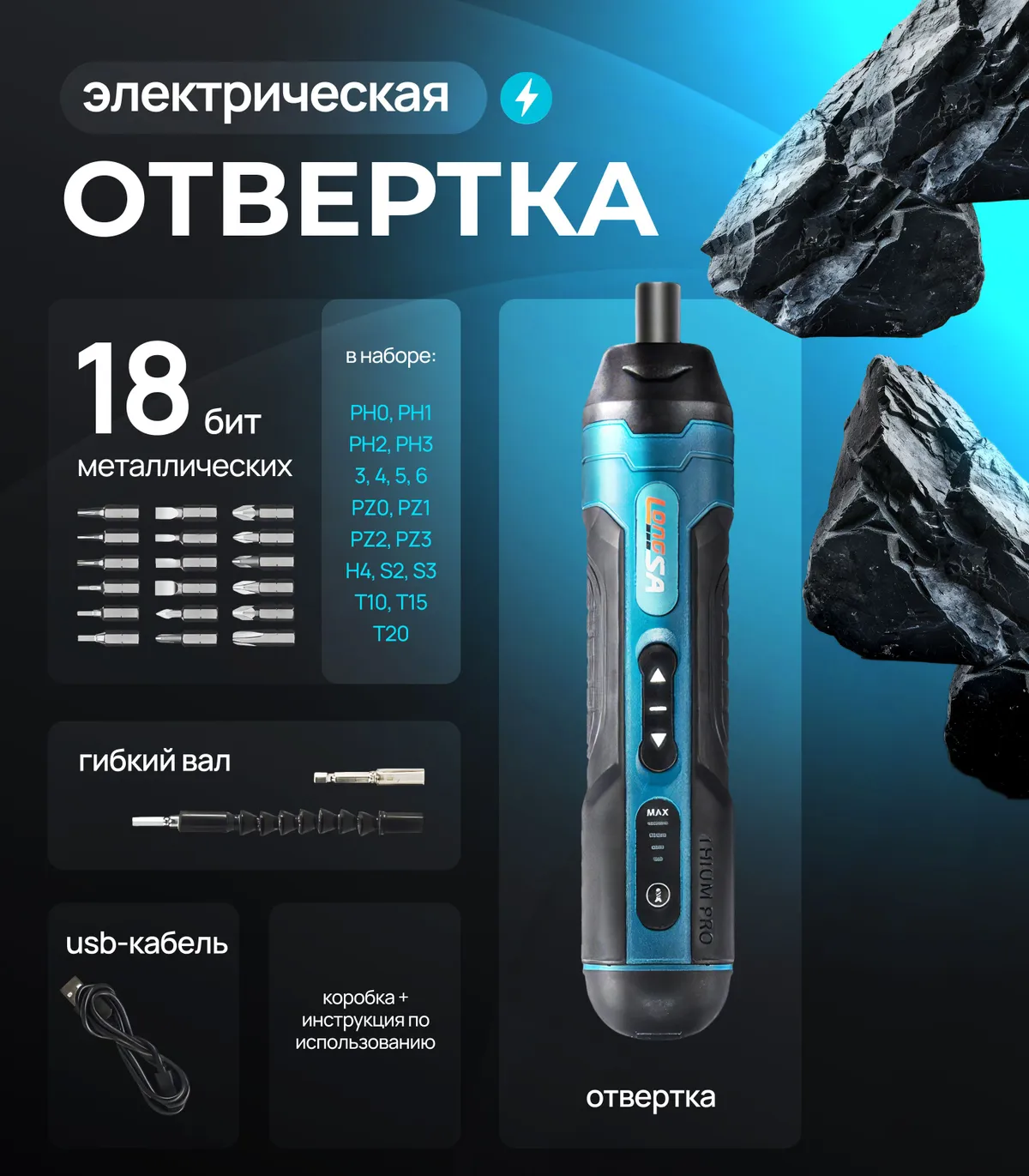 Электрическая отвертка - 1 шт; Биты (насадки) - 18 шт; Гибкий вал - 1 шт; Удлинитель для бит - 1 шт; Кабель для зарядки type-с - 1 шт B082