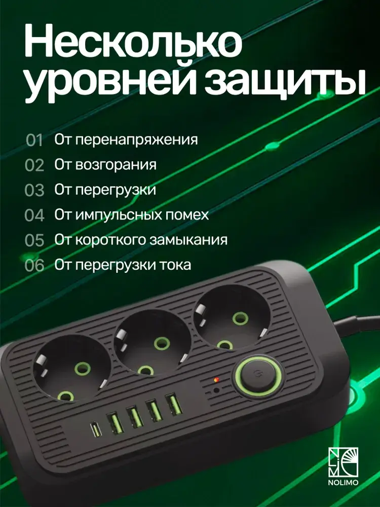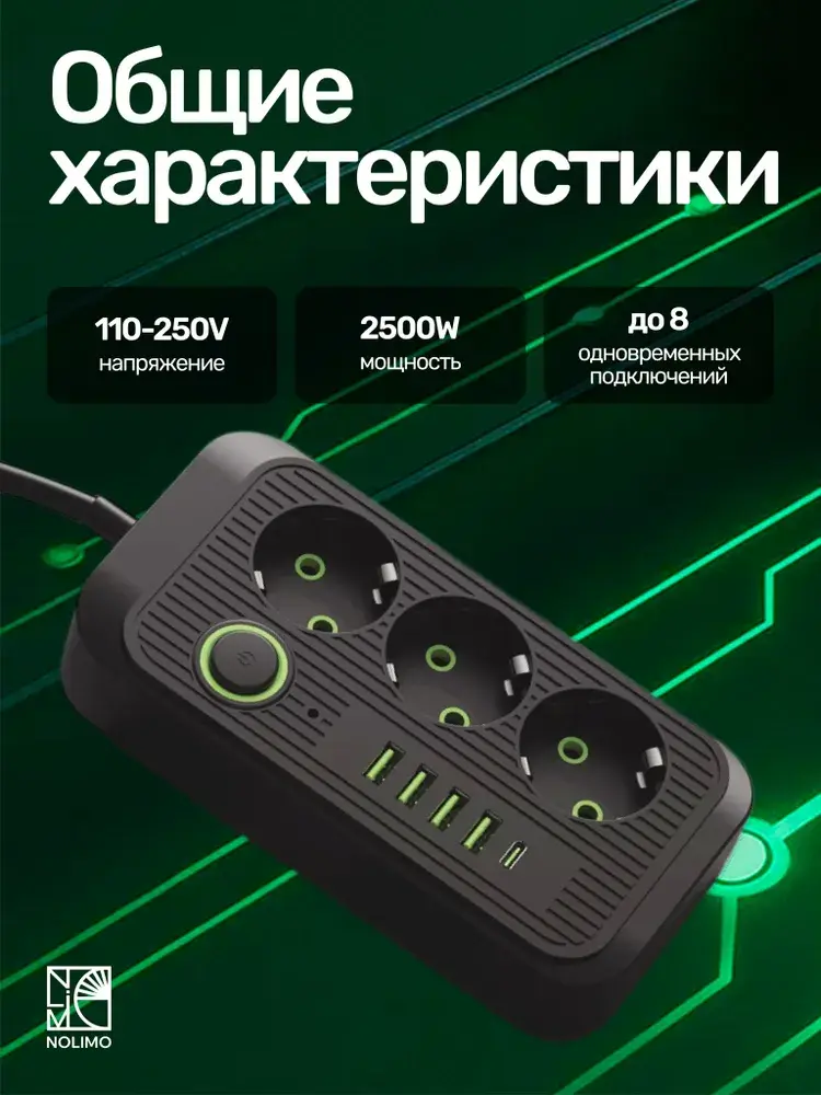 Сетевой фильтр это удобный и практичный удлинитель, который имеет 3 розетки, 4 USB-порта + 1 Type-C для увеличения количества подключаемых электрических приборов Основными преимуществами данного сетевого фильтра является удлинитель usb, функциональность, простота эксплуатации и высокий уровень безопасности в использовании Благодаря сетевому удлинителю, вы можете подключить сразу несколько устройств к одной розетке, а также заряжать свои мобильные устройства через USB-порты и Type-C. Сетевой фильтр является удлинителем сетевой вилки Евро, в комплекте которого находятся 3 европейских розетки, 4 USB-порта + 1 Type-C. Сетевой фильтр-удлинитель оснащен микросхемой, которая обеспечивает защиту от короткого замыкания и перегрузки, а также единым выключателем - это значительно упрощает использование данного удлинителя. 4. Высококачественный кабель: Удлинитель сетевой фильтр 3м с USB и Type-C поставляется с высококачественным кабелем, который обеспечивает стабильное и надежное энергоснабжение. Никогда больше не беспокойтесь о нестабильной работе ваших устройств! 5. Превосходный дизайн: Этот удлинитель сочетает в себе функциональность и стильный дизайн. Его компактные размеры и элегантная черная отделка делают его идеальным дополнением к любому интерьеру. Не упустите возможность обеспечить безопасное и эффективное энергоснабжение для своих электронных устройств! Закажите удлинитель сетевой фильтр 3м с USB и Type-C с заземлением прямо сейчас и наслаждайтесь максимальным комфортом и удобством! Предусмотрена возможность крепления на стену Длина провода 3 метра Мощность 2500 Вт Индикатор питания Выключатель питания Корпус из огнестойкого поликарбоната