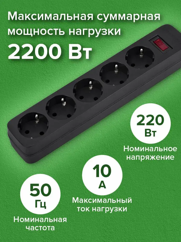 Высококачественный сетевой фильтр SONNEN SPB-505 – это простой, удобный и экономный вариант защиты электроприборов от негативных последствий перепадов напряжения. Устройство обеспечит бесперебойную работу любых электроприборов. Имеет возможность крепления на стену. Количество розеток – 5. Каждая розетка оснащена заземляющими контактами. Корпус выполнен из негорючего ABS-пластика. На корпусе расположен выключатель и автоматический предохранитель. Толщина жил кабеля – 3х1,0 мм, длина кабеля – 5,0 м. Материал жил кабеля - алюминий. Номинальная частота – 50 Гц, номинальное напряжение – 220 Вт, максимальный ток нагрузки – 10 А, суммарная мощность нагрузки – 2200 Вт. Производитель сохраняет за собой право на внесение изменений в технические характеристики, комплектацию и конструкцию данной модели для улучшения эксплуатационных свойств без предварительного уведомления. • Количество розеток: 5 шт. • Длина шнура: 5 м. • Максимальный ток нагрузки: 10 А. • Суммарная мощность нагрузки: 2200 Вт. • Защита: от импульсных помех, от короткого замыкания, от перегрузки по току. • Номинальное напряжение: 220 В. • Номинальная частота напряжения сети: 50 Гц. • Максимальная рассеиваемая энергия: 225 Дж. • Клавиша выключателя на корпусе: да. • Светодиодная индикация: да. • Корпус из негорючего материала: да. • Крепление на стену: да. • Серия: SPB. • Материал корпуса: негорючий пластик. • Цвет: черный. • Длина: 270 мм. • Ширина: 40 мм. • Высота: 50 мм. • Вес: 0.585 кг. • Гарантия: 12 мес. • Артикул производителя: 513658. Удлинитель сетевой является незаменимым инструментом в быту и офисе, используется в закрытых и открытых помещениях, позволяет подключать различные электроприборы в труднодоступных местах, на корпусе расположен выключатель питания. Подходит для ноутбука и компьютера, любой бытовой техники. Корпус состоит из негорючего пластика, что делает его стопроцентно пожаробезопасным. В нашем магазине так же представлен широкий ассортимент удлинителей разной длины и модификации, включая удлинитель 3х и 5 метров и пилот на 1,8 метра черного и белого цветов, вам так же может понадобится тройник, который свободно подключается к данному сетевому фильтру. Наши удлинители и сетевые разъёмы изготовлены из высококачественных материалов и имеют длительный срок эксплуатации. Показать полностью -1-u/ww1200/7038479190.jpg -1-e/ww1200/7038479210.jpg -1-o/ww1200/7038492828.jpg -1-2/ww1200/7038479234.jpg -1-8/ww1200/7038479204.jpg -1-y/ww1200/7038479230.jpg -1-r/ww1200/7038479223.jpg